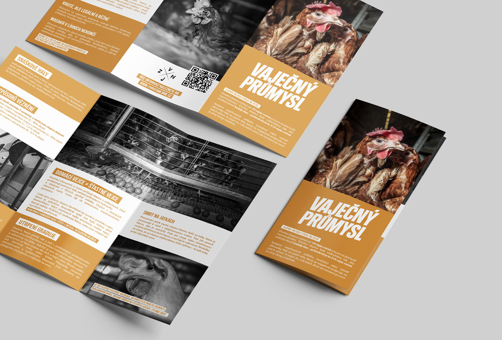 Tematická série tištěných letáků s jednotným vizuálním systémem. Kombinace silné typografie, dokumentární fotografie a barevné segmentace vytváří strukturovaný a čitelný informační materiál.